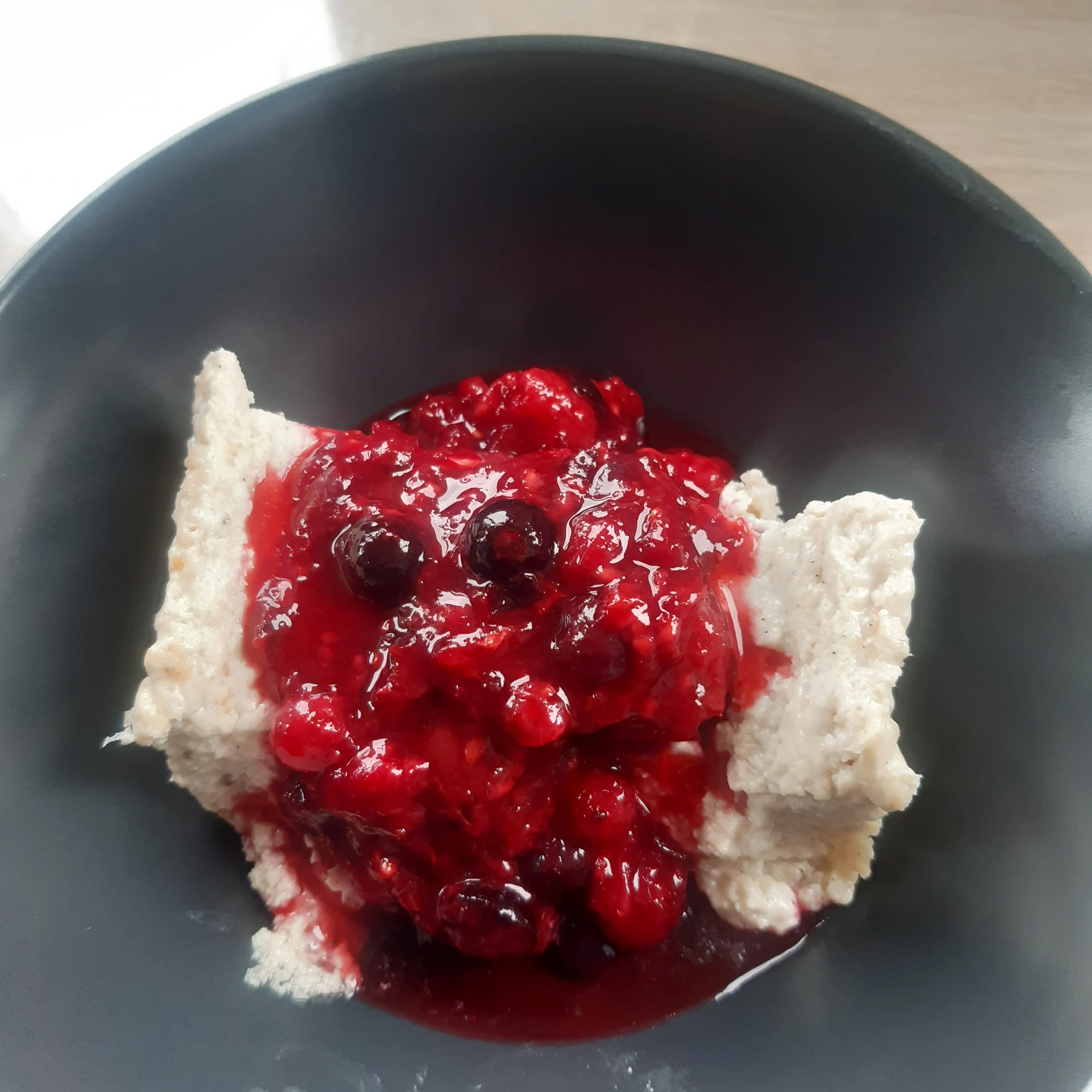 - Währenddessen die eine Hälfte der Waldbeeren pürieren, bis ein Sorbet entsteht, dann wieder mit den unpürierten Beeren vermengen.